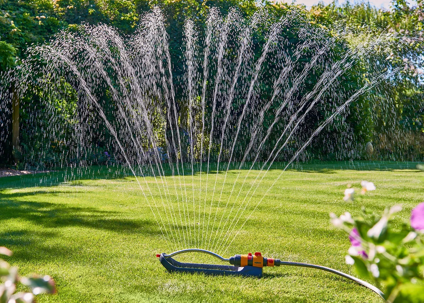 The Hozelock Rectangular Sprinkler Plus 250L (100-100-252) is a durable, water-driven oscillating sprinkler designed for, and capable of, watering areas up to 250m². It features 18 jets, adjustable flow control, and a stable sled base for consistent, even, and targeted watering on lawns, beds, and borders.